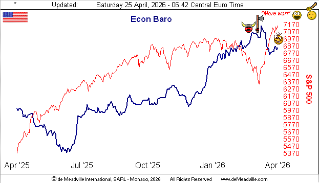 Today the S&P 500 is now 12 consecutive trading days “textbook overbought”, the “live” price/earnings ratio is 48.5x and the yield (jeepers, ’tis so tiny we can’t find it…) oh there ’tis: 1.109%. Astride the Economic Barometer, which — save for improved Retail Sales in March — basically put in an uneventful week, is the never war-weary S&P red line: