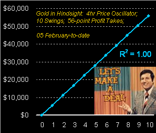 Toward closing, on a nightly basis for the website we run 405 Market Rhythm studies across all of the BEGOS Markets. And whilst nothing works in perpetuity for any market study, that which has been best for Gold through its last 10 swings is the four-hour Price Oscillator, (which is a “canned” study supplied by high-level data providers). In running this particular study through the deMeadville number-crunching, we found it to have reached an “in hindsight“ profit objective of at least 56 points 10-times in-a-row, (from 05 February-to-date with an average duration per swing of five calendar days). At $100/point/contract, here’s that “in hindsight“ profit picture:
