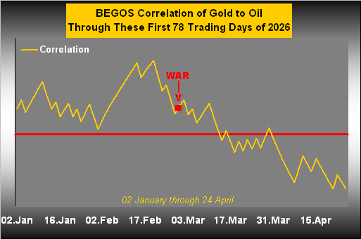 But the point is: rising Oil has led to declining Gold as we look at their BEGOS Markets (Bond / Euro / Gold / Oil / S&P 500) correlation through these first 78 trading days of 2026. Note the red square marking the war’s commencement, (Gold then 5296 vs. 4725 today, i.e. -10.8%). Beneath the red axis indicates negative correlation: