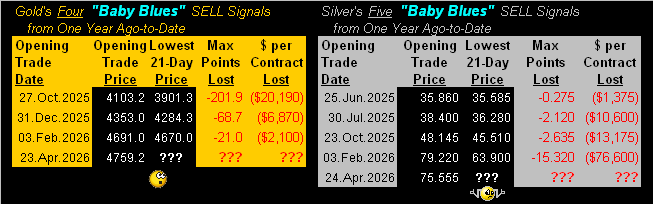 To wit, the fine team from our “There’s No Holy Grail Dept.” assembled this table of “Baby Blues” sell signals for both Gold (four) and Silver (five) from a year ago-to-date, even as we hasten to state that “Shorting Gold is a bad idea.” The maximum points and monetary losses/contract within the ensuing 21 trading days (one month) are therein compiled, the two new fresh signals with “???”: