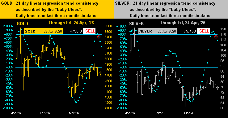 And specific to the above case for both Gold on the left and for Silver on the right, their respective “Baby Blues” have fallen through the key +80% axis per the red-encircled dots, the rule there being likely lower levels near-term.
