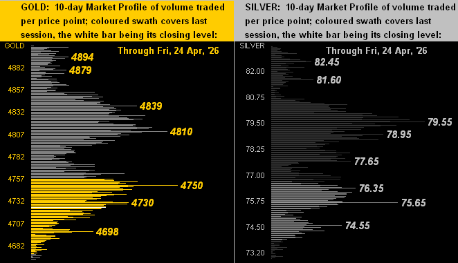 That, dear Squire, elicits the foundational cornerstone of what today is the oft-ignored essential of “cash management”, (which for you WestPalmBeachers down there means knowing precisely where you’ll exit your losing trade before even placing it). And by the white present-level bar in both of the two volume-weighted stacks, Gold by price is -3.7% from the top of its Profile, and Sister Silver -9.0%: