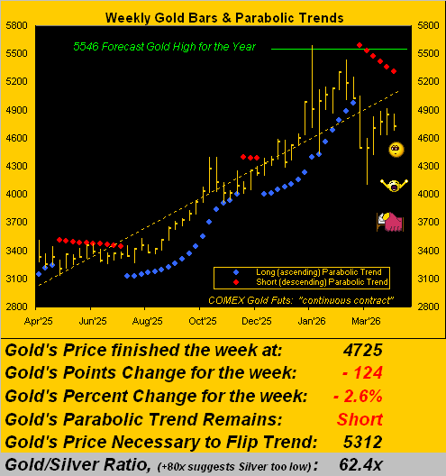 In turning to Gold’s weekly bars from a year ago-to-date, this past week’s span of 183 points was the narrowest since that ending 14 weeks back on 16 January, even as the expected weekly trading range remains rather robust at 349 points, (and the daily 112 points). Too, contract volume in April is comparably subdued to that traded in March. Thus as we saw by the “Baby Blues” falling off, Gold may be seeking a rest, especially given how otherwise volatile this year’s first quadrimester has been: