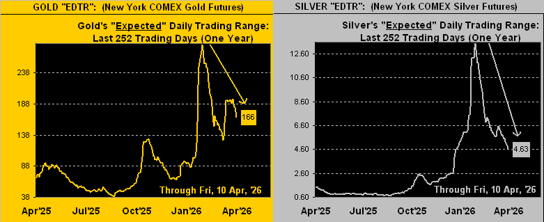 Broadly, Squire, Gold’s ranginess indeed can still be characterized as “wide”, yet of late clearly compressing, as too is that for Silver. Here from a year ago-to-date per the website are the EDTRs (“expected daily trading ranges”) for Gold on the left and for Silver on the right, both well off their respective peaks of recent weeks; (again for you WestPalmBeachers down there, this is not price, rather the expected range thereto from day-to-day):