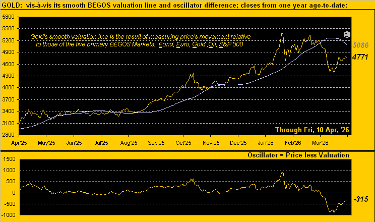 Price too has been recovering relative to its BEGOS Market Value, which as initially depicted in the opening Scoreboard and as below labeled at 5086, is in decline even as Gold settled yesterday (Friday) at 4771, but still -315 points under its smooth valuation line: