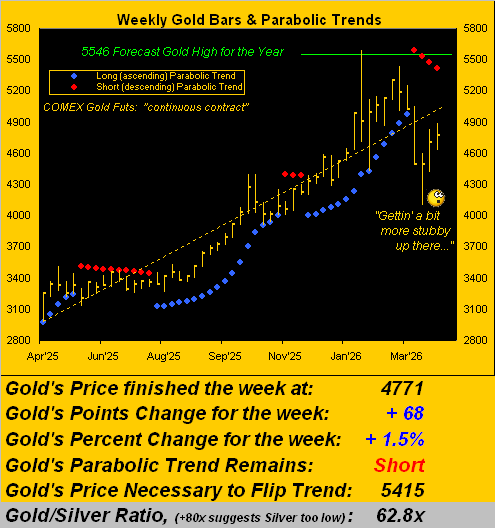 Still, as we turn to Gold’s weekly bars and parabolic trends from a year ago-to-date, notwithstanding a fourth rightmost red Short dot, price has posted both “higher highs” and “higher lows” for two consecutive weeks in perceivably pursuing a return to the ascending dashed trendline. This past week’s low-to-high range of +262 points (+5.7%) ranks narrowest of the past four, despite its expected weekly trading range having anticipated a span of 369 points: