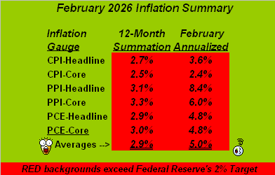 Now: recall the late, great, heavily Brooklyn-accented Joan Rivers? “Kin we tawk??” … in this case about inflation. Throughout the past two years, we’ve regularly herein displayed our monthly summaries of inflation, time and again citing its rate stubbornly running above the Federal Reserve’s desired annualized target of +2.0%. And yet across all those many months has come the usual FinMedia speculation of “How many times will the Fed cut this year?” Thus rolls on the Investing Age of Stoopid wherein actually performing math has become comprehensively replaced by people parroting what everybody else says and posts. But has the time now finally arrived to “pay the piper”, (i.e. raise rates)? Here’s our inflation table for February, now sporting the most over-extended “above target” paces in recent years. And that’s pre-war, Folks: