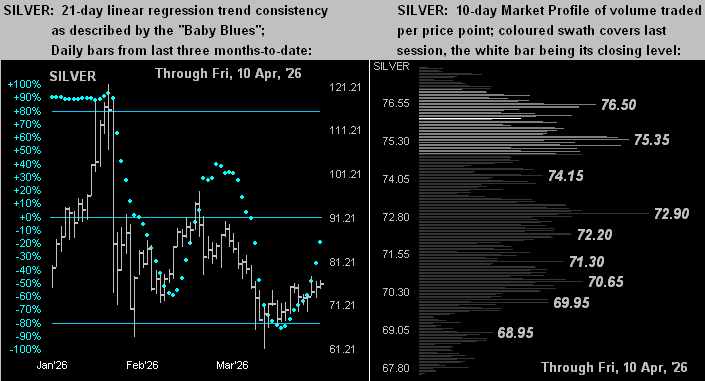 Quite similar is the drill for Silver, although having settled the week at 76.03 finds her a distant +33.9% above Fair Value of 56.77. But as with Gold, Silver’s “Baby Blues” (below left) are rising as her trend becomes less negative, whilst per her Profile (below right) she appears supported down to 72.90. “As overvalued as you are, Sweet Sister Silver, we still love you!”