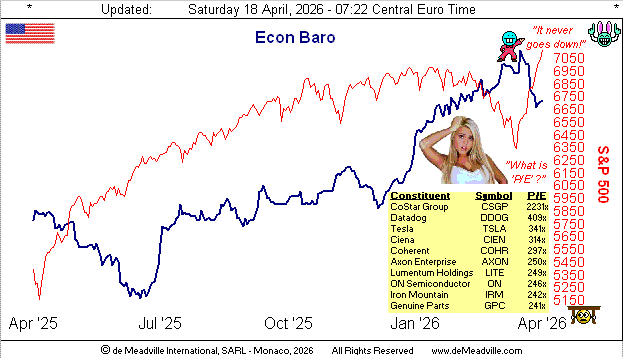 Meanwhile, to the suddenly sagging Econ Baro we go, ignored ‘natch by an S&P all aglow, the high P/Es list pulled from the website you know:
