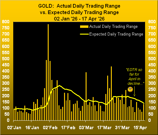 Either way, with Gold having settled its week yesterday (Friday) at 4849, the compressing of range continues. The following graphic is our year-to-date view of Gold’s actual daily trading ranges (the bars) vis-à-vis each day’s EDTR (the line). Clearly during April, daily range has been narrowing. In fact, specific to the past 10 trading days’ ranges, none have reached up to the EDTR, even as ’tis been contracting: