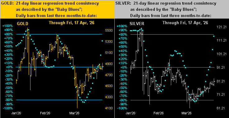 And speaking of increases, even as trading ranges narrow, our baby blue dots of regression trend consistency have been well on the rise for the precious metals as we below see for Gold on the left and for Silver on the right by the day across the past three months. Recall “Follow the Blues instead of the news, else lose yer shoes…”? Indeed you do: