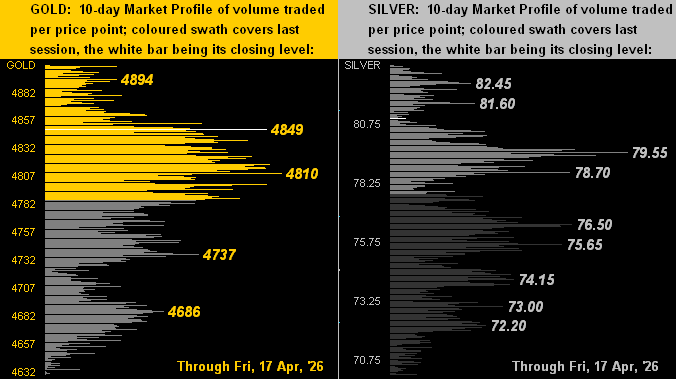 Too, we’ve the 10-day Market Profiles for Gold (below left) and for Silver (below right). Price is supportively-positioned in both cases, the yellow metal by the 4800s and the white metal basically by the 79 handle, her having just settled a completed week above 80 (at 80.93) for the first time since that ending 13 March. Cautiously however by the Scoreboard, whereas Gold is presently +23.2% above Fair Value (3937), Silver is +42.4% above same (56.82). Hang in there, Sister Silver…