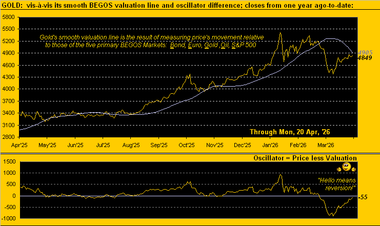 Meanwhile from the “Means Reversion Dept.” we’ve this updated graphic of Gold from a year ago-to-date along with its smooth valuation line born of price’s movement relative to those of the five primary BEGOS Markets as therein noted. To reprise, ’twasn’t that far back on 26 March (only 15 trading days ago) that Gold settled at a record -886 points (-16.8%) beneath valuation. Now as we below see, ’tis just -55 points “low”. As we oft quip, “Means reversion is a beautiful thAng” … (however, when it finally hits the S&P 500, ’twill be horrifying, perhaps per our wrap). Here’s the Gold graphic with price nearly having reverted back up to valuation, (which is a swifter valuing of Gold than is Fair Value by which Gold remains quite high):