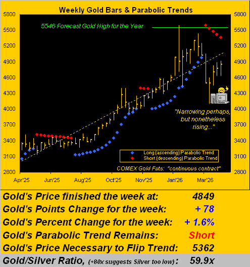 Not that Gold’s hasn’t gone anywhere. Price year-to-date has spanned from 5586 (our forecast high 5546) down to 4100 (our forecast low 4136), a range of -1486 points (-26.6%). ‘Course, with 179 trading days remaining in 2026, ’tis far too soon to “take credit” that we “nailed it”. But range has been nonetheless narrowing. Both of the past two weeks have recorded notably narrower trading ranges (262 and 292 points chronologically) than those of the three prior (571, 501 and 413 chronologically). So to Gold’s weekly bars we go, the red-dotted parabolic Short trend having completed its fifth week, such stance having commenced back on 16 March when priced opened at 5010: